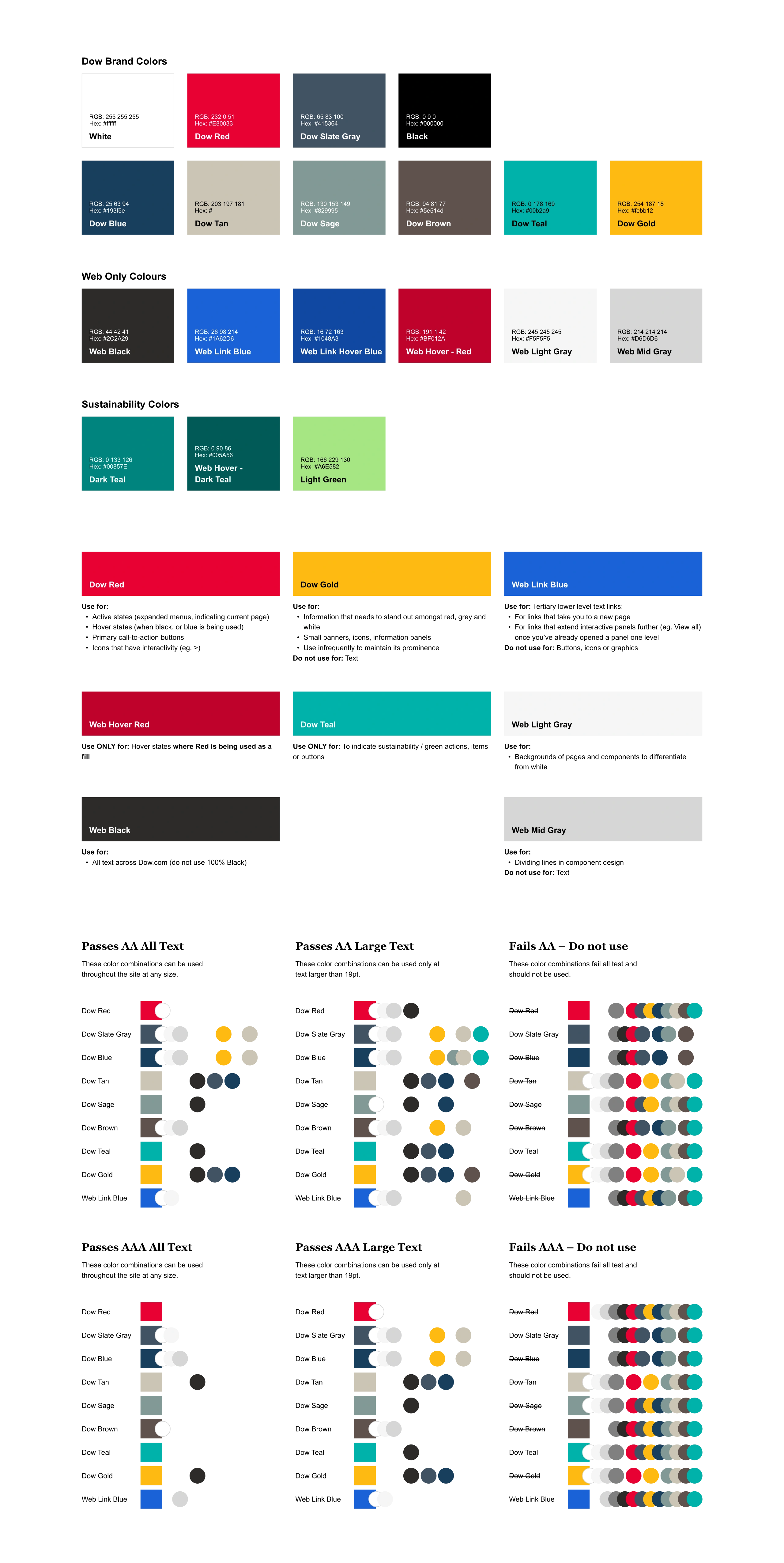 One of the largest visual challenges was working with the shade of red that has remained within Dow’s branding for almost a century. Dow understandably did not want this diminished or eliminated, so the expansion and introduction of new colors and color rules went through numerous iterations and tests to meet the accessibility concerns. This reverberated throughout the system, improving accessibility and legibility within nearly every component possible.