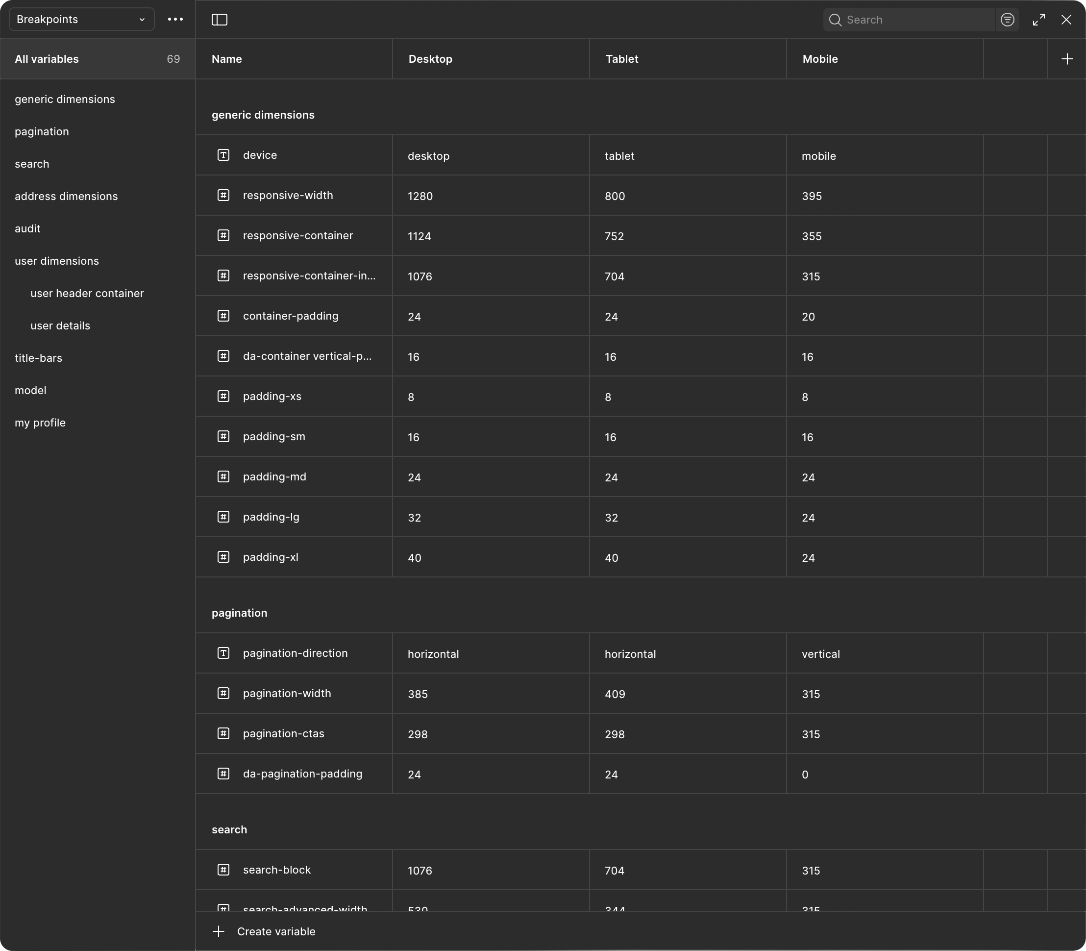 - The creation/cultivation of a variable database in Figma. This tool got introduced to Figma during the course of this project, and Pete dove in headfirst figuring out how to make it work for us. It was incredibly useful for updating large portions of the design system more easily, while adhering to the spacing and layout rules we were refining. All the work I did within these particular nuts and bolts is based on Pete’s pioneering.