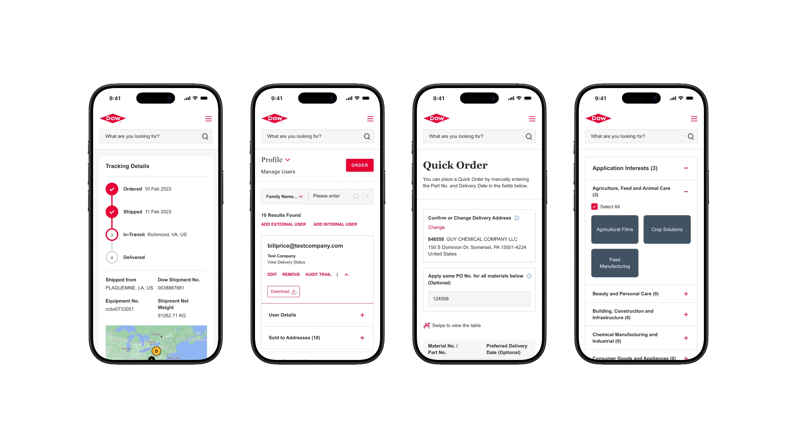 My Account is the ordering system used throughout Dow to purchase materials, organize product and customer lists, and track orders. Its utilities also includes catalogs for products and brands, invoicing and returns systems, customer and contract management dashboards, and an admin backend- all of which ties into multiple different cart systems.